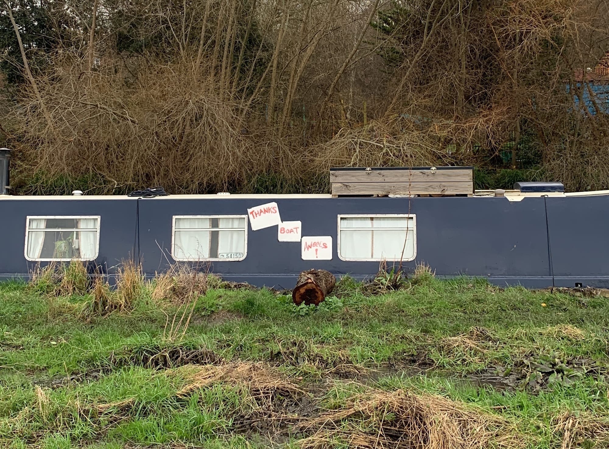 The next day, I walked out along the gravel path at the edge of the marshes, to cry in the fresh air. There was a handwritten sign stuck on one of the narrowboats we’d looked after in the flood. “Thanks boat angels,” the sign said.